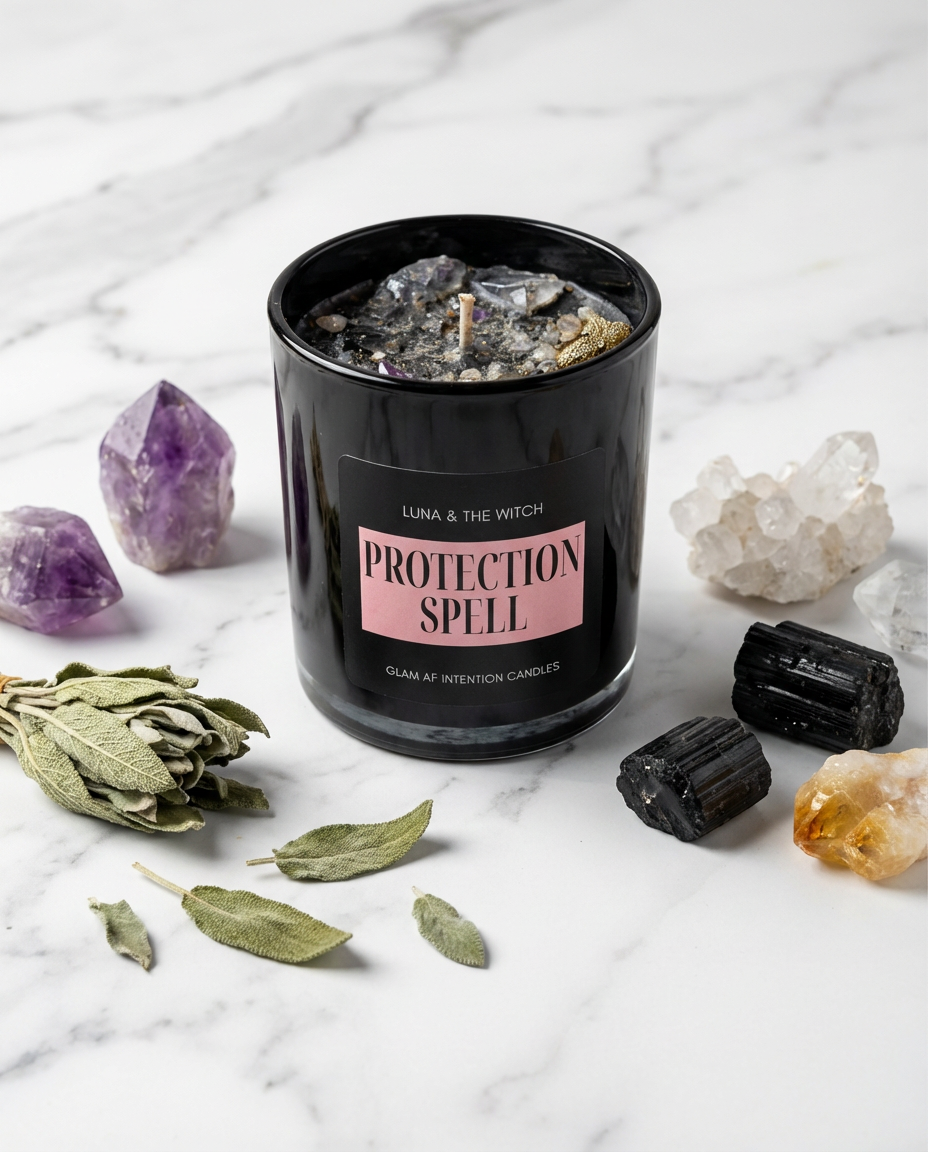 Each candle is hand-poured in black wax, traditionally associated with protection, and infused with a considered blend of protective crystals selected to support grounding, clarity, and energetic balance.