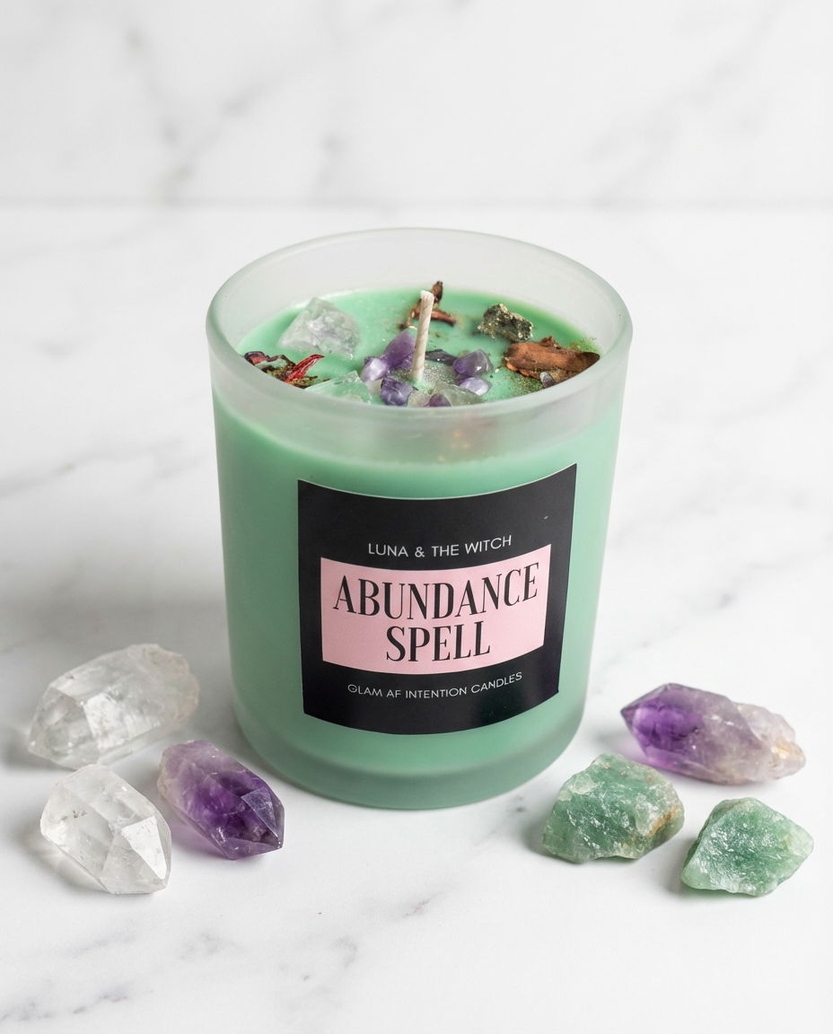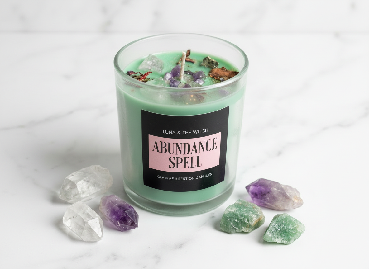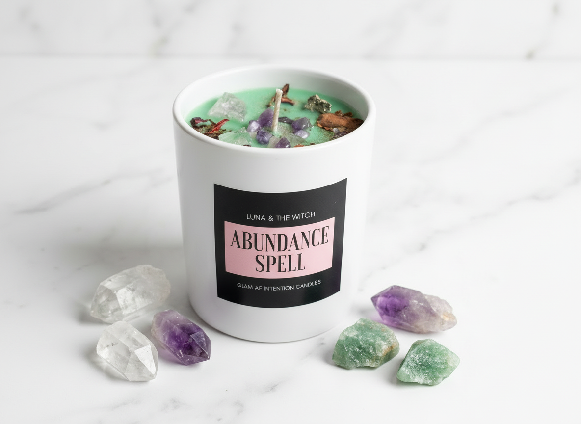 Each Abundance Spell candle is infused with a considered blend of crystals selected to support prosperity, clarity, and energetic balance.